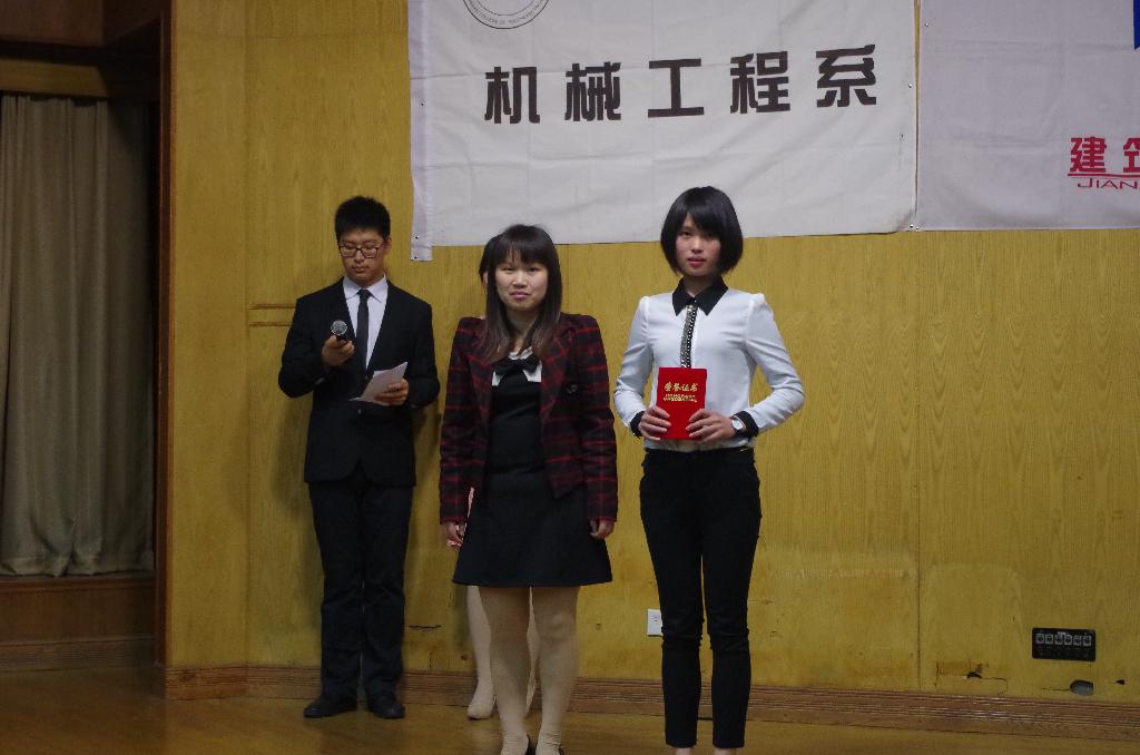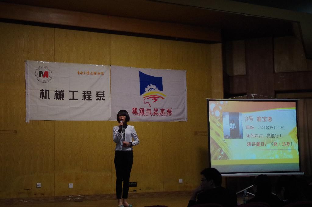 4月16日晚,系分团委关于学习习近平总书记 “四进四信”重要讲话的主题演讲比赛决赛在真知馆报告厅顺利举行,机械工程系综合办主任严红霞老师,机械工程建筑与艺术系分团委书记江晶老师,机械工程辅导员袁兴博老师,建筑与艺术系辅导员李敬老师担任决赛评委。 此次演讲比赛经过初选,共有8名同学进入了决赛。决赛中,各个选手精心准备,有的幽默诙谐,有的成熟稳重,有的激情昂扬,每个人都通过这次比赛展现了自己高超的口语表达能力和特色的人格魅力。经过第一轮自我展示和第二轮主题演讲的激烈比拼,来自14环艺2班的翁宝蓉同学凭借个人朴实而又动人的演讲《路•追梦》博得了评委老师和观众的心,获得了一等奖,其他分获二、三等奖。 翁宝蓉同学在展现精彩的演讲 评委老师们认真地欣赏比赛 机械工程系综合办主任严红霞老师与获一等奖选手合影