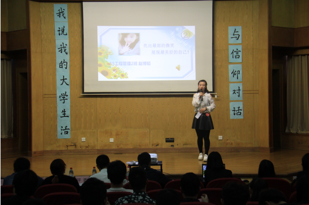 比赛在同学们的掌声中拉开了序幕。在两位主持人向全场一一介绍在场评委后,参赛选手按照抽签的顺序依次上场进行精彩的演讲。此次决赛共有9位选手入围进行角逐,每个选手的演讲内容都很丰富,各有特色,通过激昂的说词和抒情的语调抒发了对大学生活的热爱和对青春的赞扬。例如9号选手介绍了自己一年来在学生会与社团活动的点点滴滴并表达出对于学习专业知识的热情。随后,比赛进入了第二环节。选手们通过现场抽签,两两分组,对现场提供的五个话题进行演讲,展现对生活与信仰的深层思考。5号选手通过多方列举生活案例完美诠释了“智慧总是在孤独中生根”这一话题。