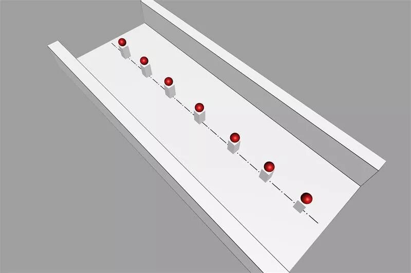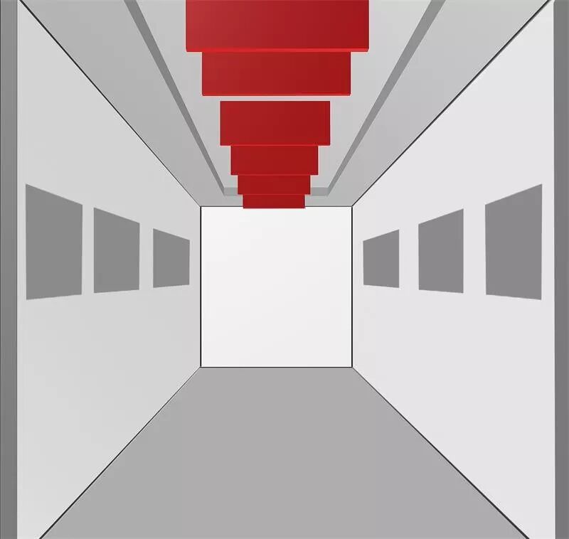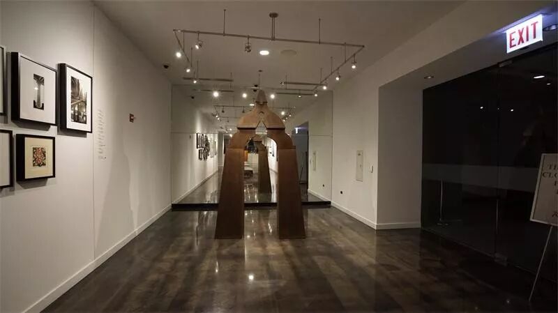 当陈设品布置在狭长空间的端头时,减少两侧界面和顶棚、地面的装饰,减弱其照度,并加强灯光对陈设品的照度,从而迫使人们的观赏视线通过空间轮廓的透视消失线集中到陈设品上。如图 3.1.15 a 为了突出廊道中的雕塑而将灯光照明集中在雕塑上。