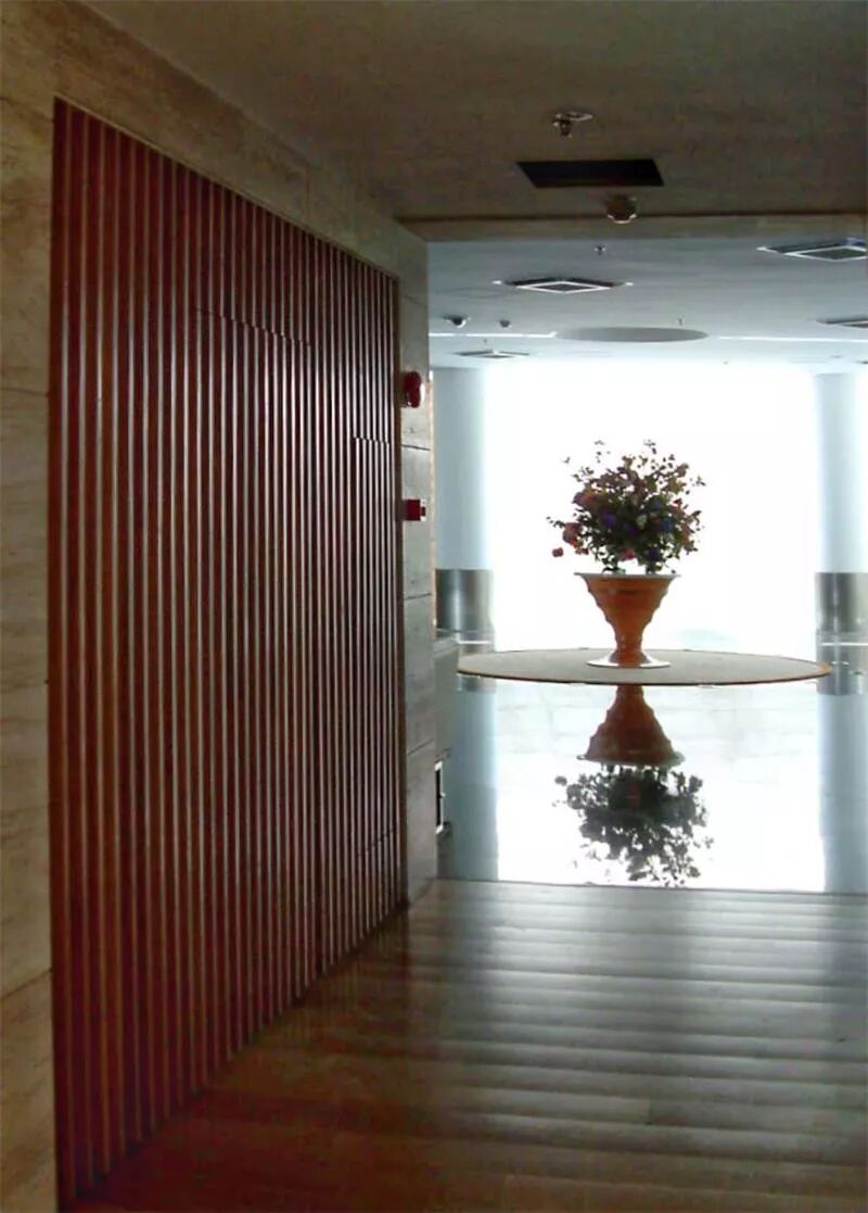 5)肌理明显的陈设品容易感知,如图 3.1.5 酒店中木质肌理的装置(详图见《室内陈设设计教程》);