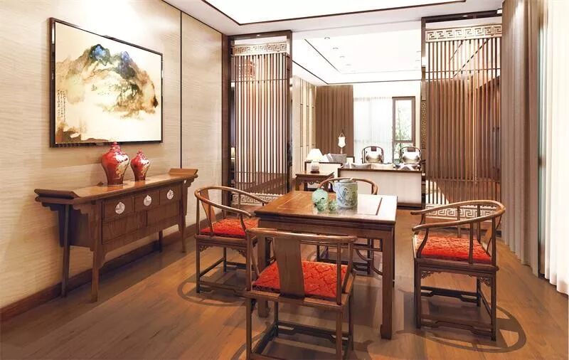 人在视觉感知某个或某组物体表象时总是将其作为一个整体来把握,而不是分散地、孤立地感受单个或几个物体。这就使人明晓室内陈设品的布置需要和室内的整体风格与感觉相一致。这是由于人们在走进一个空间时,首先知觉的是这个房间的整体风格而不是单个的陈设品,即使陈设品本身都经过精挑细选,一旦陈设品的风格与整体环境格格不入,人的视觉感受一定会做出整体性欠佳的判断。如图 3.1.12 为具有民国风格的住宅室内装饰装修,室内所有的字画、器皿、家具等都根据民国风格的特点进行选择而精心布置。如图 3.1.13 a 为某公寓精装修房的陈设品布置,在现代风格样式确定后,陈设品的部位、数量都经过缜密考虑,力求达到整体风格的协调一致。