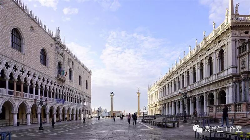 我在圣马可大小两广场转悠过多次,深感圣马可广场是开阔的、舒展的、富有韵味的……。但使我困惑的是:整体感很强的圣马可广场的空间是不同风格的建筑组成:大广场上圣马可教堂立面中既有显明哥特式建筑的垂直构建,又有拱起的拜占庭风格的穹顶和绘画,至于室内,其平面更是典型的基督教堂惯用的十字架平面。广场两侧的建筑,一边是较典型的古典建筑,另一边在古典建风格中渗透了巴洛克风格。两个广场的交叉处是一钟楼,它是大小两广场的制高点和视觉中心。钟楼原为海上航行的瞭望塔,现成为圣马可广场的标志性构筑物,高高耸立的灰红色调的钟楼是什么风格我不太清楚,但钟楼与两边的长廊,与圣马可教堂,与广场的整体环境无论从尺度上还是色彩上评价都很协调。