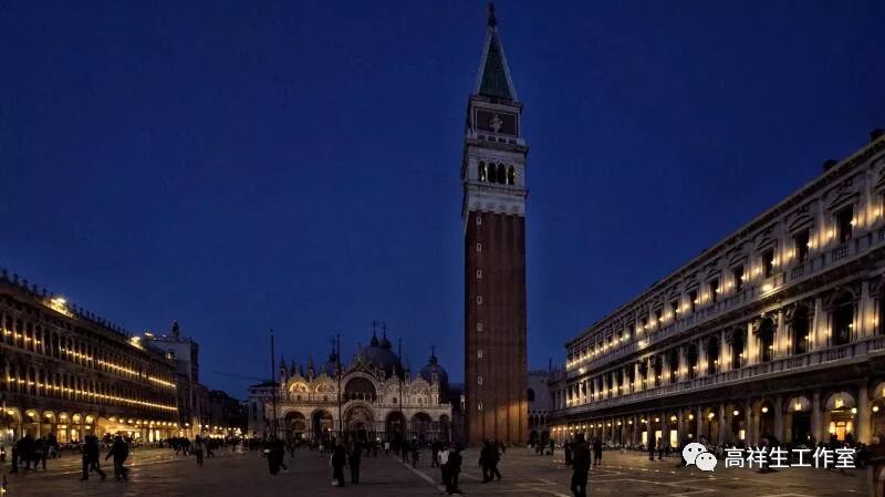 拿破仑说过“圣马可广场是欧洲最美的客厅。”广场一端的圣马可教堂披红戴绿,金光闪闪。在佛晓霞光的衬托下圣马可教堂的形态动人;而阳光照耀下的圣马可教堂更为妩媚,盘旋的海燕使教堂的室外空间更加生动;夜幕下的圣马可教堂和环境都已笼罩在深蓝色的色调里,这时的教堂显得格外安静。