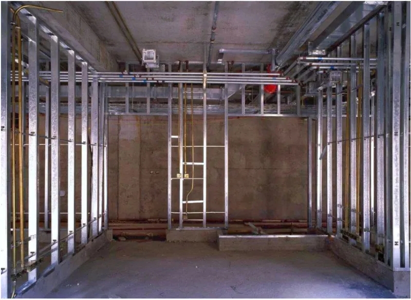在顶面、地面上固定沿顶、沿地轻钢龙骨,采用膨胀螺栓固定。将竖向轻钢龙骨(间距不大于600mm)插入沿顶、沿地龙骨之间,开口方向保持一致。