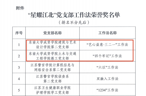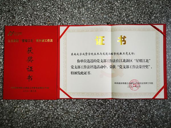 为深化党建强基系列行动,真正把党建基因融入江北新区发展血脉,进一步发挥基层党组织战斗堡垒作用和党员先锋模范作用,PA集团推选的PA集团官网第二党支部“艺心益意·三二一”工作法和土木与交通工程学院教工党支部“四个牢记”工作法在江北新区此次“星耀江北”党支部工作法评选活动中双双获奖。