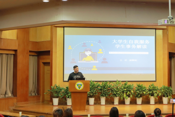 建艺院特邀学生处处长助理颜秉明老师主讲。颜老师将游戏用语NPC(指游戏中不受真人玩家操纵的游戏角色)融入主题讲座,用大学生喜闻乐见的方式进行解读。他从大学生事务中心介绍、校园卡、学生证、医疗保险、生活服务、事物招领等六个方面,结合丰富生动的案例,解读了学生事务与发展中心提供的事务服务。