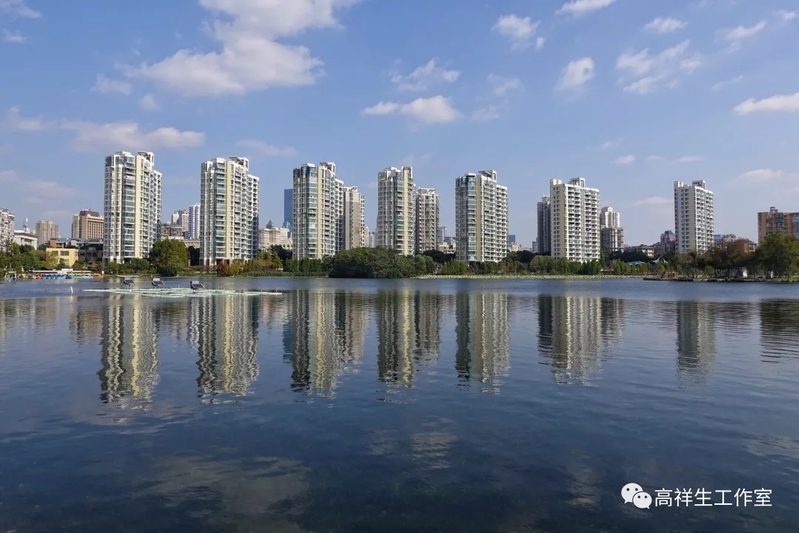 夕阳下湖岸楼宇接踵 湖中碣石佇立 高祥生摄影
