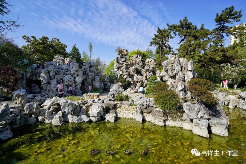 公园中的庭园、水池中都有湖石相拥,院落、小径都以卵石或片石铺地。湖面上碧波荡漾,游船穿梭,碣石佇立,白鹅拨水,临湖听风,楼宇接踵。建筑的空间与空间有廊道、门洞相通。