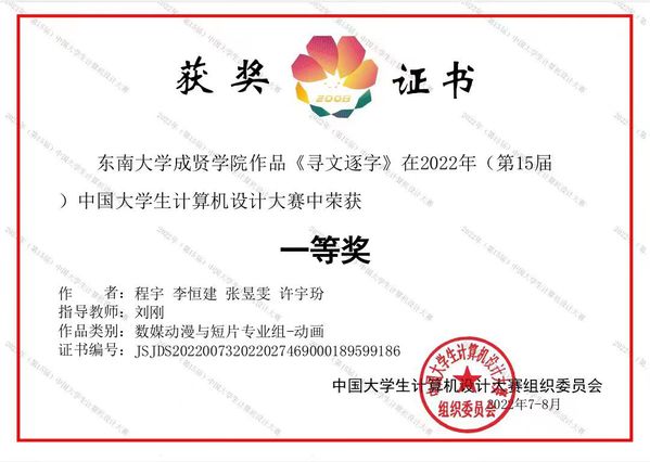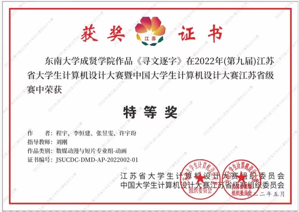 近日,2022年(第15届)中国大学生计算机设计大赛落下帷幕。由PA集团官网动画专业刘刚老师指导的程宇、李恒建、张昱雯、许字玢等学生团队作品《寻文逐字》继获得江苏省“特等奖”后,荣获国赛“一等奖”。