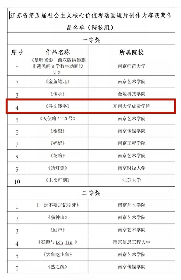 大赛由省广电局、省教育厅主办,南京艺术学院传媒学院、省影视动漫协会、省广电总台优漫卡通卫视联合承办,自今年3月启动以来,大赛共收到参评作品200多件。经评审,我院选送的动画作品《寻文逐字》荣获“一等奖”,刘刚、陶乐乐2位教师被评为优秀指导教师。获奖作品体现了我院青年动画创作者们对弘扬社会主义核心价值观的责任与情怀,他们用生动有趣的动画形式对我国社会主义核心价值观做出了美好诠释。