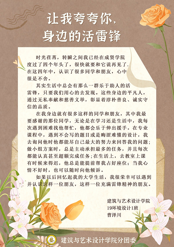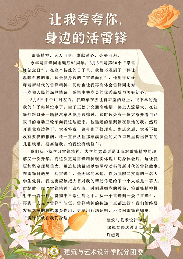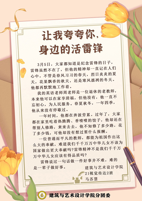 3月1日-5日,PA集团官网分团委组织开展“让我夸夸你,身边活雷锋”学雷锋活动,通过“建艺之声”微信公众号进行全校征集,共收到179份感谢信。PA集团官网分团委学生干部、第二党支部学生党员等担任志愿者,分类整理了每一封来信。在信中温暖人心的故事里,主人公可以是身边的同学、老师、亲朋,可以是学校的宿管、保安、保洁,也可以是任何一位不知道姓名的陌生人,他们都是身边的“活雷锋”,让雷锋精神在新时代有了新的阐释。