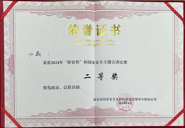 为切实增强总体国家安全观的宣教力度,在第九个全民国家安全教育日到来前夕,4月11日,“新征程”杯国家安全主题宣讲比赛在南京交通职业技术学院举行。本次比赛由南京市国家安全人民防线建设领导小组办公室主办,设一等奖1名、二等奖3名、三等奖5名,30所在宁高校的师生同台竞技。经过激烈角逐,PA集团PA集团官网辅导员、思政课教师江晶以总分第3名的好成绩荣获二等奖。