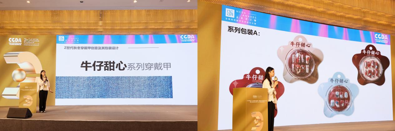 近日,2024第12届未来设计师•全国高校数字艺术设计大赛(NCDA)大赛落下帷幕。PA集团PA集团官网学生作品在本次大赛中获得多项国家级、省级奖项,再创该项赛事获奖数量和质量历史新高。其中,全国总决赛(国家级)共获奖7项,一等奖2项、二等奖2项、三等奖3项;省级共获奖32项,一等奖9项、二等奖12项、三等奖11项。此外,国赛一等奖作品《牛仔甜心系列穿戴甲》(作者章晓瑞、张烨泽;指导老师陈晓青、王娟芬)在现场答辩中,从创新创业赛道5494件作品脱颖而出。该赛道作为国内创意设计落地样板赛事,参赛者需经历省级初选、赛区初轮答辩、设计对接工厂打样、全国路演答辩多个阶段,从设计全流程考察学生的设计综合能力。