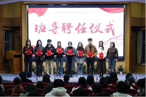 随后进行班导聘任仪式,学院综合办主任徐曼老师为2024级班导颁发聘书。在2024级青马学员初入大学感到懵懂的时候,陪伴大家的不仅有指引大方向的辅导员们,还有在各个方面与大家深入交流的班导们。2022级姜子宜、王栋、季姝琳、江星毅、姜可心、张斯羽、刘阳、钱宇晴、唐亦婷、晏艺文用激情与担当,为各自指导的班级做出实质性贡献。